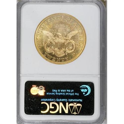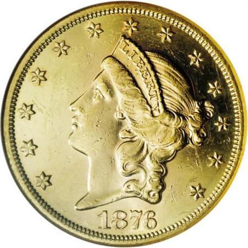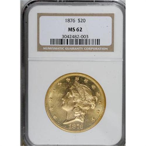 <B>1876 $20 MS62 NGC.</B></I> Light Motto. This final year Type Two twenty has flashy luster and a pleasing strike. Field marks are present but appropriate for the grade. The Light Motto subtype was only struck in 1876, and is identified by the specific shape of the first two rays above the left (facing) wing.<BR><BR><B>Coin Engraver:</B> James B. Longacre<BR><BR><b>Shipping:</b> Coins & Currency (<a target="_blank" href="http://www.heritageauctions.com/common/shipping.php">view shipping information</a>)