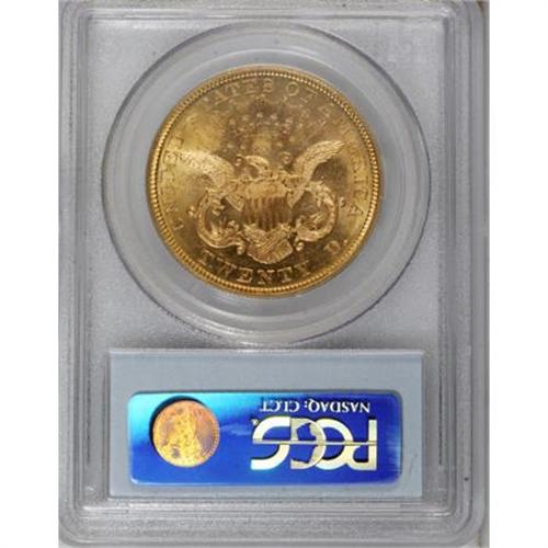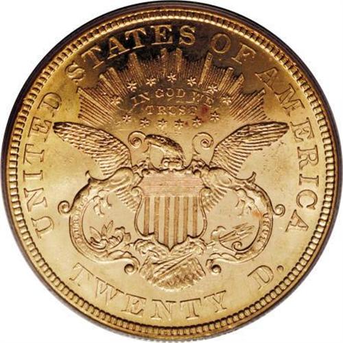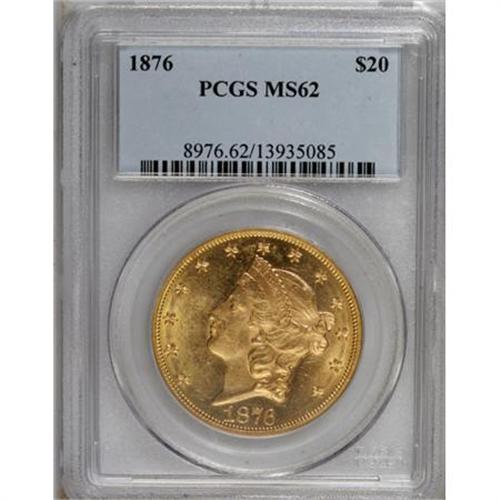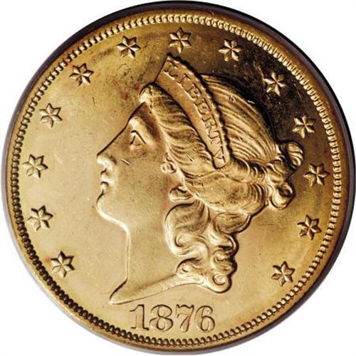 <B>1876 $20 MS62 PCGS.</B></I> Light Motto subtype, used only on certain 1876 double eagles. A flashy example with a semi-prooflike obverse and exemplary eye appeal. Marks are inconsequential for the MS62 level. The portrait is particularly void of blemishes. An excellent candidate for the gold type buyer.<BR><BR><B>Coin Engraver:</B> James B. Longacre<BR><BR><b>Shipping:</b> Coins & Currency (<a target="_blank" href="http://www.heritageauctions.com/common/shipping.php">view shipping information</a>)