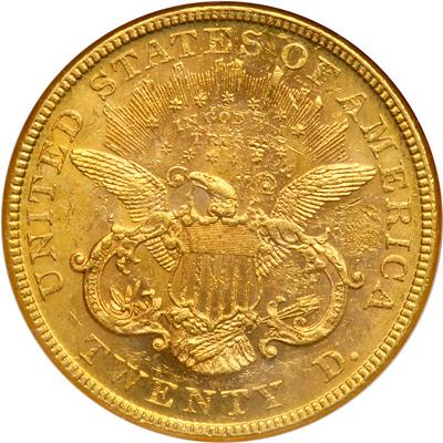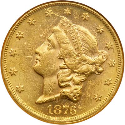 1876 $20. NGC graded AU-58. Gorgeous golden-sunset toning on both sides, the fields and devices lustrous. We see a short scratch through the 6th star.