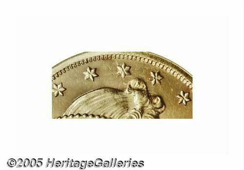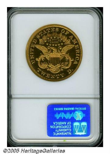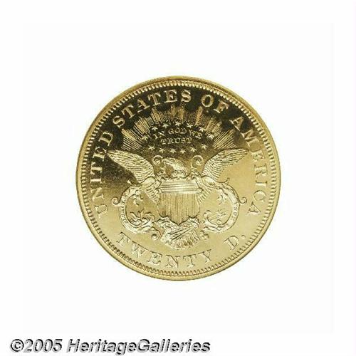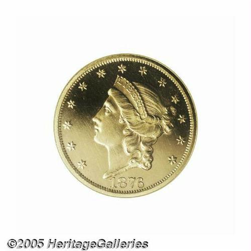 <B>1876<$20> PR63 Cameo NGC.</B></I> This regal coin is double struck on both the obverse and reverse, with at least a five degree rotation between the strikes. The strength of the second strike nearly obliterated any evidence of the first strike, but it can clearly be seen on stars nine through eleven, and on the upper portion of Liberty's hair bun. Similarly on the reverse, doubling can be seen on the Y D. of TWENTY D. and the ICA of AMERICA (these areas are directly opposite of each other). The Cameo contrast adds to the general appeal of this desirable coin, with the mirror fields are well preserved. We do note some hairlines in the fields which account for the grade, otherwise this coin would grade much higher. Centennial year issue, and also in demand as this is a Type II Double eagle. Identifiable by the double striking and by a minute planchet flake centered above the glory rays below the O in OF. Numerous small lumps are seen on the obverse, from a slightly rusty die used to coin these, one located above Liberty's eye, a few more down the back of her face and neck. Perhaps two dozen are known from the original mintage of 45 pieces, this coin certainly one of the finer ones to survive. <BR><I>From the Ed Trompeter Collection, and so noted on the NGC insert.</B></I>