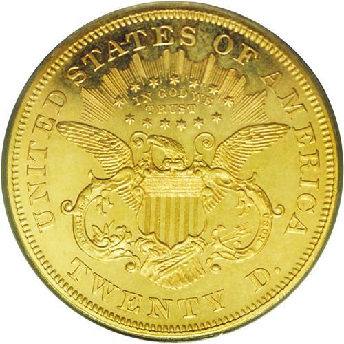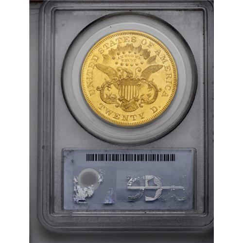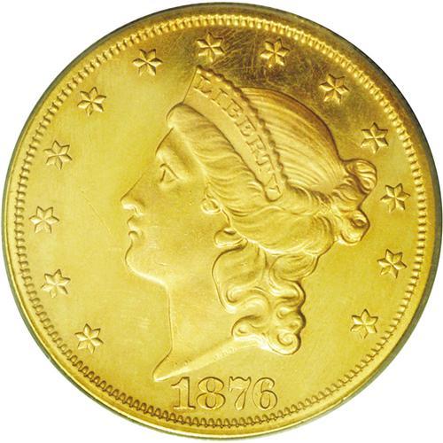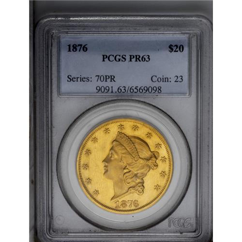 <B>1876<$20> PR63 PCGS.</B></I> Both sides of this desirable and rare proof have rich orange-gold color with hazy blue toning on the surfaces. A thin scratch is present in the left obverse field, but there is no evidence of other blemishes on either side. The rims are sharp and square with all other design elements similarly sharp. The devices are slightly lustrous with light cameo contrast evident, although not sufficient to qualify for a Cameo designation.<BR> From the original 45-coin mintage, we believe that only about a dozen examples still exist today, although the number may be as high as 15 coins. At least one example, the Eliasberg-Trompeter specimen, is triple struck. The important of a proof Type Two double eagle cannot be overemphasized. The entire series was limited to just 11 years, and all are extremely rare in proof format. With 12 to 15 examples known, this 1876-dated double eagle is the most plentiful of any date in proof quality. We doubt that even 100 proof double eagles of this design type survive today, including all 11 dates. <BR><BR><B>Importan