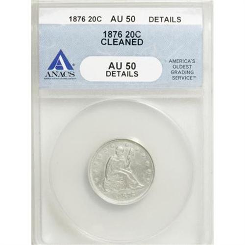 <B>1876 20C --Cleaned--ANACS. AU50 Details.</B></I> NGC Census: (10/289). PCGS Population (32/322). Mintage: 14,600. Numismedia Wsl. Price for NGC/PCGS coin in AU50: $450. (#5299)<BR><BR><B>Coin Engraver:</B> William Barber<BR><BR><b>Shipping:</b> Coins & Currency (<a target="_blank" href="http://www.heritageauctions.com/common/shipping.php">view shipping information</a>)