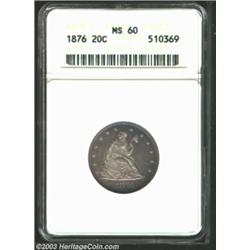 1876 20C MS60 ANACS. Violet and ruby-red hues visit this well struck and somewhat prooflike piece. Attractive despite a few faint slide marks in the upper obverse field. The lower right reverse is lightly strike doubled. Important notice: We expect to be auctioning lots at the rate of 200-250 per hour. On occasion eBay live bid software cannot keep up with the pace of the auctions where 4-5 lots per minute can hammer down, so we recommend that you place a realistic absentee bid now as insurance to avoid disappointment. Also please note that all Heritage/CAA lots purchased through eBay Live carry a 20% Buyer's Premium. Please make sure you read the Terms and Conditions.