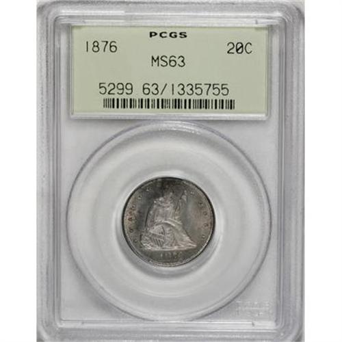 <B>1876 20C MS63 PCGS.</B></I> Satiny silver surfaces with reflective fields and a splash of dark steel toning at the top of the obverse.<B><BR></B></I><I>From The Beau Clerc Collection.</B></I><BR><BR><B>Coin Engraver:</B> William Barber<BR><BR><b>Shipping:</b> Coins & Currency (<a target="_blank" href="http://www.heritageauctions.com/common/shipping.php">view shipping information</a>)
