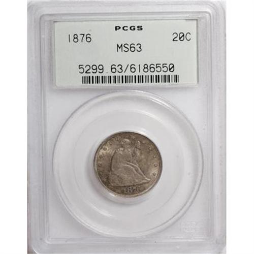 <B>1876 20C MS63 PCGS.</B></I> This Select example displays smoky champagne-gray and purple-rose coloration, yielding to greenish iridescent accents near the peripheries. Boldly struck and satiny, with a few minor blemishes on the obverse. A scarce, low mintage issue from the Civil War era.<BR><I>From The Casa Becca del Norté Collection.</B></I><BR><BR><B>Coin Engraver:</B> William Barber<BR><BR><b>Shipping:</b> Coins & Currency (<a target="_blank" href="http://www.heritageauctions.com/common/shipping.php">view shipping information</a>)