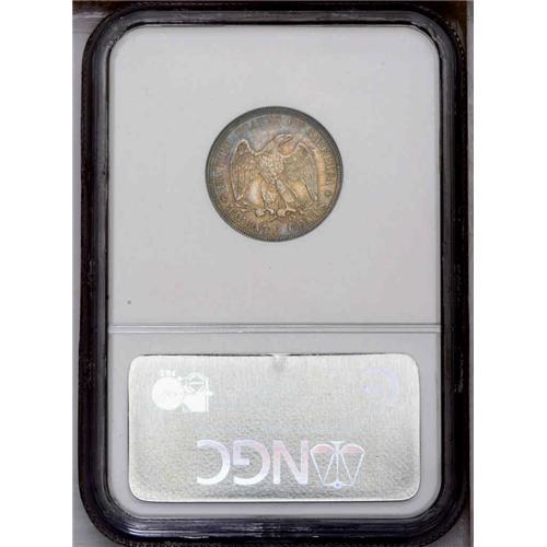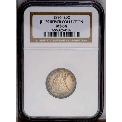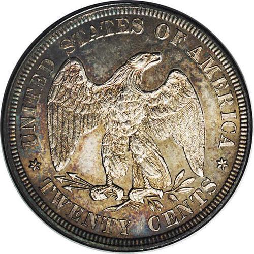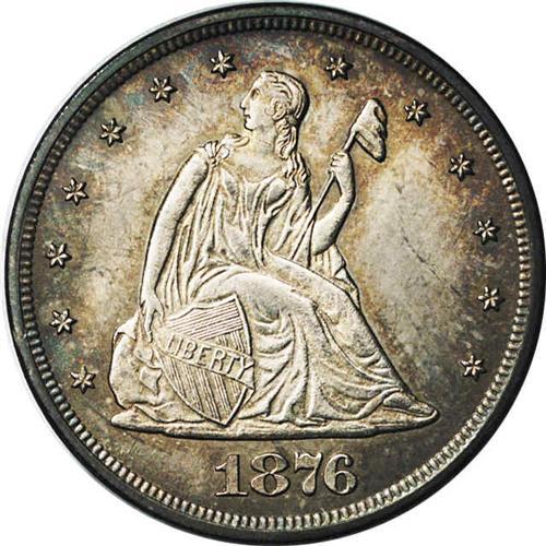 <B>1876<20C> MS64 NGC.</B></I> Pewter gray toning with delicate pink, blue, violet, and gold iridescent highlights. The devices are frosty and the fields are satiny. Virtually all design features are boldly and deeply defined, save for some softness noted on portions of the eagle's claws. Not an easy issue to find this nicely preserved.