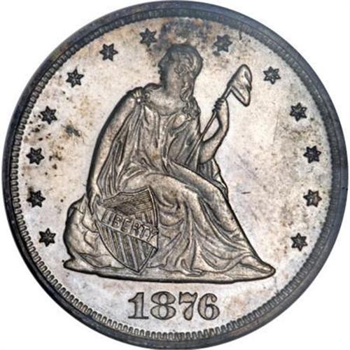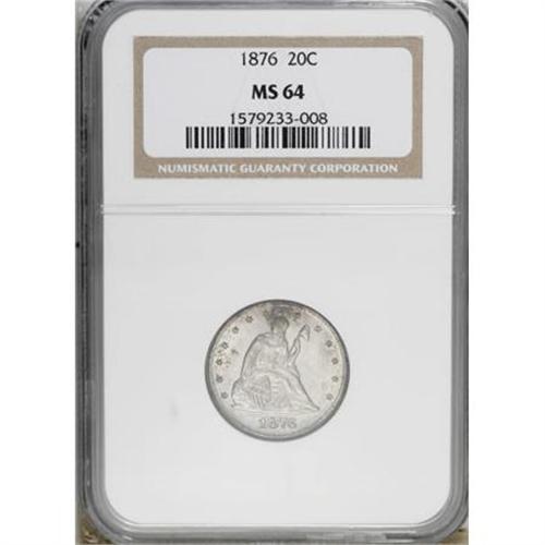 <B>1876 20C MS64 NGC.</B></I> 1875 saw the introduction of the ill-fated twenty-cent piece, with relatively large production figures from three mints, especially San Francisco. By 1876, it was evident that the denomination was a failure, with the 14,640 circulation strikes minted during the year in Philadelphia representing the last hurrah. This is an attractive example of this final P-mint business strike issue, highly lustrous with a gray-silver color almost reminiscent of platinum. Charcoal toning is evident near Liberty's head and the left portion of the obverse. The few visible surface marks are entirely in line with the assigned grade.<BR><BR><B>Coin Engraver:</B> William Barber<BR><BR><b>Shipping:</b> Coins & Currency (<a target="_blank" href="http://www.heritageauctions.com/common/shipping.php">view shipping information</a>)