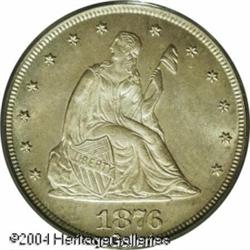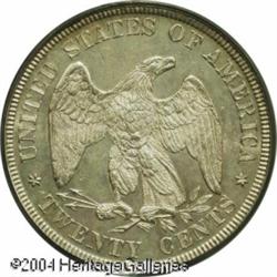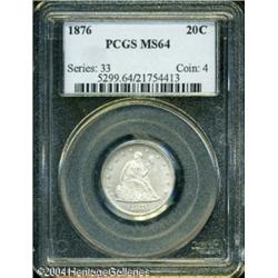 1876 20C MS64 PCGS. With an original mintage of on <B>1876 20C MS64 PCGS.</B></I> With an original mintage of only 14,640 business strikes, the 1876 had an original production run only 1/78th that of the more common date 1875-S. This coin has satiny, lightly marked surfaces, and a coating of milky patina over each side. The strike is intricately detailed throughout. A much scarcer Twenty Cent issue. <BR><BR><B>Important notice:</B> Heritage usually auctions material at the rate of 200-250 lots per hour. On some occasions eBay Live bid software or the Internet may not be able to keep up with the pace of the auction. We recommend placing a realistic absentee bid now as insurance to avoid disappointment. Occasionally the auctioneer may eliminate or reject an eBay Live bid, and the auctioneer may also reopen a lot after the close of the eBay live bidding (usually because we missed an audience bid), and may reject your bid even if it shows you as the winning bidder. By bidding via eBay Live, you agree that Heritage may award the lot to another bidder at its sole discretion under the circumstances described above or any other reasonable circumstances. Since eBay bids are not shown to us until we open the lot on the floor, we treat those bids just like floor bids. In most cases the floor responds before the eBay bid is presented to us, due to Internet lag time, so for consistency we have made it a policy that floor bids are always considered first over tie eBay live bids. Also please note that all Heritage lots purchased through eBay Live carry a 20% Buyer's Premium. Please make sure you read the Terms and Conditions before you bid. This lot is being auctioned in conjunction with a live floor auction by Heritage Galleries & Auctioneers. All final auction and invoice information will be supplied by Heritage Galleries & Auctioneers, and all other information should be considered preliminary. Lot:5868