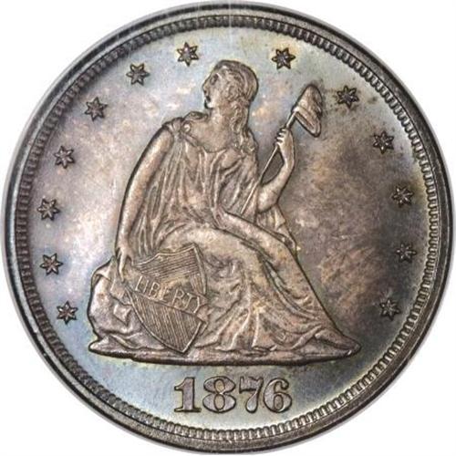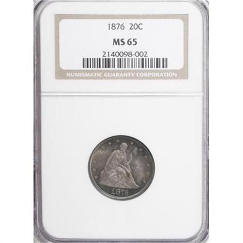<B>1876 20C MS65 NGC.</B></I> Second year of issue and a low mintage issue with only 14,750 circulation strikes. The striking details are fully defined on each side, including the head of Liberty, the upper left ridge of the eagle's wing, and the eagle's talons. The soft, frosted mint luster has an overlay of rose-gray in the centers with sea-green around the margins. An important Gem twenty cent piece. Census: 35 in 65, 20 finer (6/07).<BR><BR><b>Shipping:</b> Coins & Currency (<a target="_blank" href="http://www.heritageauctions.com/common/shipping.php">view shipping information</a>)