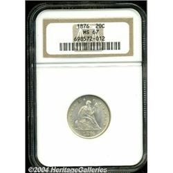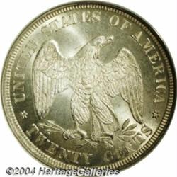 <B>1876<20C> MS67 NGC.</B></I> Produced for only four years from 1875-1878, the twenty cent piece is perhaps the oddest denomination in U.S. coinage history. The most common date of this type is the 1875-S, with a mintage of 1.1 million pieces. The Philadelphia Mint delivered only two business strike issues, the 1875 and the 1876. The latter date is infrequently offered in any grade, a fact that should come as no surprise given the paltry original mintage of 15,900 pieces. To this cataloger's knowledge, we have not offered a representative of this issue whose technical quality can match that of the present Superb Gem. This coin is free of even the most trivial abrasion, and the luster is full and vibrant with a richly frosted texture. The strike is essentially full, but a few areas of slight bluntness of detail are noted around the edge of the eagle's left (facing) wing on the reverse. Pale champagne and gold iridescence overlays both sides of this spectacular specimen. This MS67 representative is one of only five coins so graded by NGC, while PCGS has designated just one example at the same level, and none have been graded finer by either service (6/04). <BR><BR><B>Important notice:</B> Heritage usually auctions material at the rate of 200-250 lots per hour. On some occasions eBay Live bid software or the Internet may not be able to keep up with the pace of the auction. We recommend placing a realistic absentee bid now as insurance to avoid disappointment. Occasionally the auctioneer may eliminate or reject an eBay Live bid, and the auctioneer may also reopen a lot after the close of the eBay live bidding (usually because we missed an audience bid), and may reject your bid even if it shows you as the winning bidder. By bidding via eBay Live, you agree that Heritage may award the lot to another bidder at its sole discretion under the circumstances described above or any other reasonable circumstances. Since eBay bids are not shown to us until we open the lot on the floor, we treat those bids just like floor bids. In most cases the floor responds before the eBay bid is presented to us, due to Internet lag time, so for consistency we have made it a policy that floor bids are always considered first over tie eBay live bids. Also please note that all Heritage lots purchased through eBay Live carry a 20% Buyer's Premium. Please make sure you read the Terms and Conditions before you bid. </span></font></tr></table></td></tr></table>
