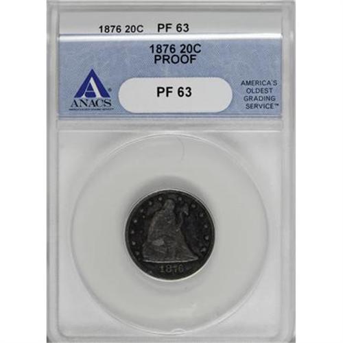 <B>1876 20C PR63 ANACS.</B></I> A deeply toned proof from our Centennial year, this is a desirable piece in the short-lived twenty cent series, the only collectible example bearing the date. The fields are mirrored and there appears to be evidence of underlying cameo contrast.<BR><BR><B>Coin Engraver:</B> William Barber<BR><BR><b>Shipping:</b> Coins & Currency (<a target="_blank" href="http://www.heritageauctions.com/common/shipping.php">view shipping information</a>)