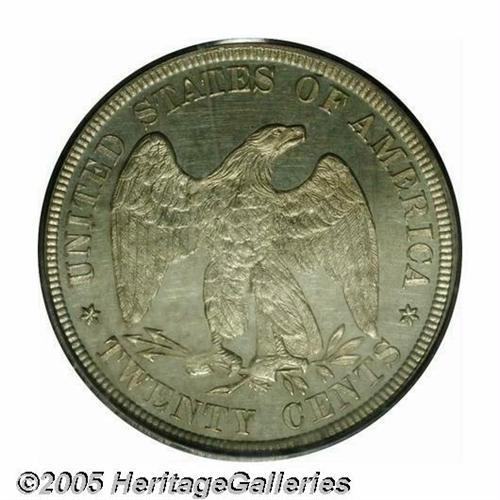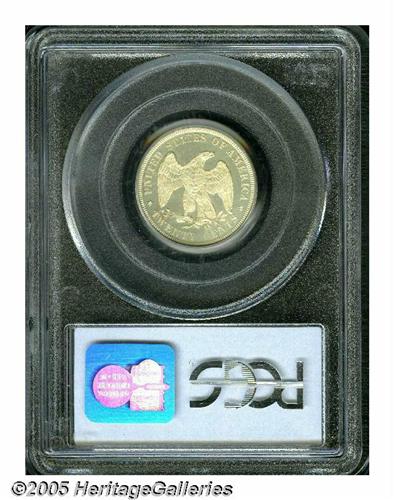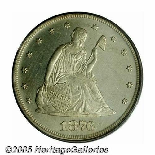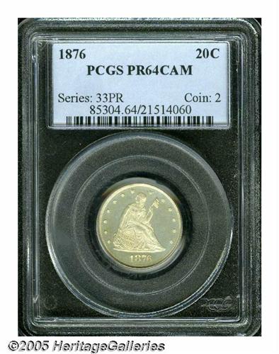 <B>1876<20C> PR64 Cameo PCGS.</B></I> The only hint of toning on this near-Gem proof example is a very light coating of smoky-golden color on each side. The strike is strong, but there are some notable hairlines, particularly in the obverse field that limit the grade. Population: 14 in 64 Cameo, 9 finer (4/05).