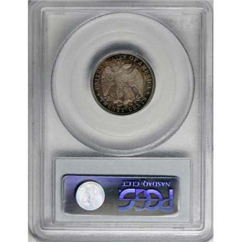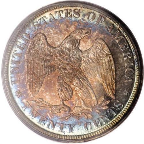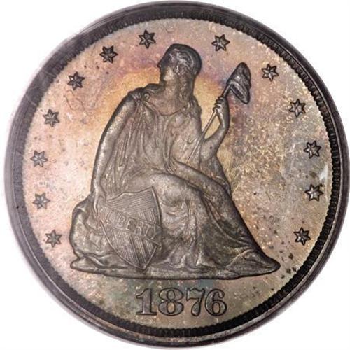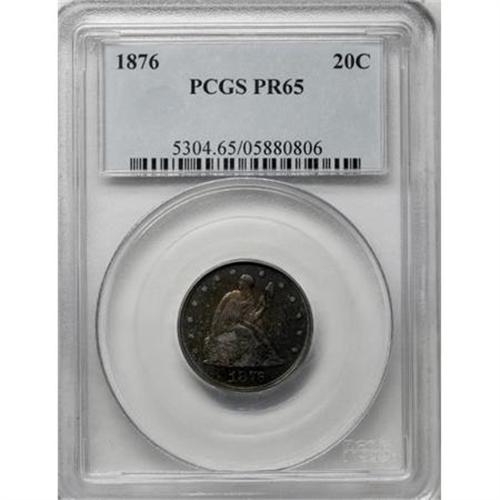 <B>1876 20C PR65 PCGS.</B></I> 1876 saw the final year of circulation issue twenty cent pieces, although proofs would continue until 1878. Because it is not under additional demand from date collectors, the 1876 proof can be acquired in most grades for somewhat less than its later date counterparts. This is a colorful coin, toned in gold-mauve on the obverse, and in swaths of gold, burgundy, and blue emanating out from the reverse center. A few pinpricks appear to define the grade.<BR><BR><B>Coin Engraver:</B> William Barber<BR><BR><b>Shipping:</b> Coins & Currency (<a target="_blank" href="http://www.heritageauctions.com/common/shipping.php">view shipping information</a>)