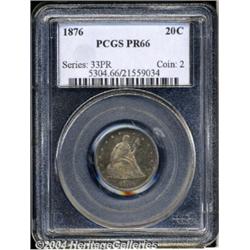 <B>1876<20C> PR66 PCGS.</B></I> The 1876 was the second year proofs were produced of the Twenty Cent piece, and only 1,260 coins were struck. This is a lovely, exquisitely preserved premium Gem that has deep antique-gold, dark rose-brown, and sea-green toning over each side. The surfaces seem mark-free and, of course, the striking details are razor-sharp. Very scarce in such a superior state of preservation.<BR><I>From The Harold W. Anderson Collection, Part Two.</B></I> <BR><BR><B>Important notice:</B> Heritage usually auctions material at the rate of 200-250 lots per hour. On some occasions eBay Live bid software or the Internet may not be able to keep up with the pace of the auction. We recommend placing a realistic absentee bid now as insurance to avoid disappointment. Occasionally the auctioneer may eliminate or reject an eBay Live bid, and the auctioneer may also reopen a lot after the close of the eBay live bidding (usually because we missed an audience bid), and may reject your bid even if it shows you as the winning bidder. By bidding via eBay Live, you agree that Heritage may award the lot to another bidder at its sole discretion under the circumstances described above or any other reasonable circumstances. Since eBay bids are not shown to us until we open the lot on the floor, we treat those bids just like floor bids. In most cases the floor responds before the eBay bid is presented to us, due to Internet lag time, so for consistency we have made it a policy that floor bids are always considered first over tie eBay live bids. Also please note that all Heritage lots purchased through eBay Live carry a 20% Buyer's Premium. Please make sure you read the Terms and Conditions before you bid. </span></font></tr></table></td></tr></table>