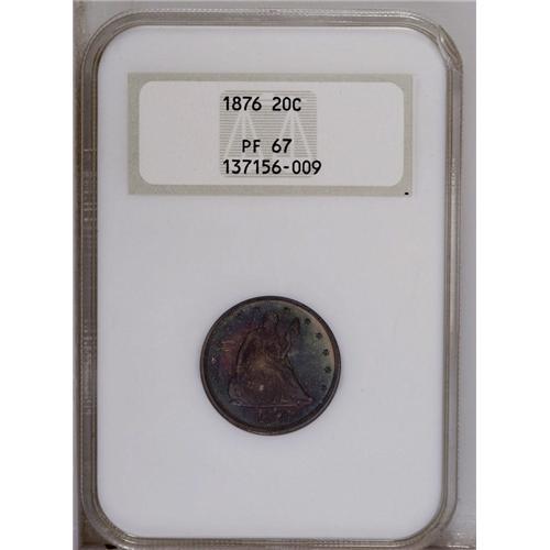 <B>1876 20C PR67 NGC.</B></I> The Philadelphia Mint's output of twenty cent pieces in 1876 amounted to just 15,900 examples, 1,290 of which were proofs. This colorful Superb Gem ranks among the finest specimens extant. Enhancing both sides is a rich overlay of natural cobalt-blue and deep crimson toning gained from years of careful storage. Of the 1876 twenty cent proofs offered by Heritage, only the amazing PR68 that we sold in the November 2004 Palm Beach Sale surpasses the technical merits of this masterpiece of color and quality. Census: 2 in 67, 3 finer (1/06).