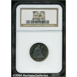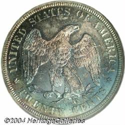<B>1876<20C> PR68 NGC.</B></I> The Coinage Act of March 3, 1875 authorized the 20-cent denomination. Patterns were first produced in 1874, in anticipation of this act. Inherent problems caused the denomination to come to an end almost as fast as it began. The size was too close to that of the Liberty Seated quarter, and the design (especially on the obverse) was nearly identical. These coins were issued for circulation only in 1875 and 1876, and in proof format from 1875 through 1878.<BR> The 1875 Coinage Act was very brief, consisting of four short paragraphs or sections. Section 1 stated that a silver coin of the twenty cent denomination would be struck from time to time and would weight five grams. Section 2 limited the legal tender status to five dollars in any single payment. Section 3 limited the legally tolerated deviation to one and a half grains, or two-hundredths of an ounce in one thousand pieces. Finally, section 4 simply stated that laws then currently in force would apply equally to the new 20-cent piece.<BR> This coin was struck in the year of the Centennial Exhibition in Philadelphia's Fairmount Park, only a short distance from the Mint. Exhibit organizers had asked the Mint to place its collection on display at the event, but Mint officials turned down the invitation on the grounds that it would be much too difficult to disassemble the glass-enclosed display. They invited visitors to the Centennial event to make the short journey to the mint for the purpose of viewing the collection. At the same time, the Mint produced a larger than usual number of proof coins, presumably to take advantage of higher anticipated demand for such coins from Centennial visitors. The 20-cent piece was the only exception to this rule, having a higher mintage in 1875, the first year of issue.<BR> This sensational and Superb Gem Proof has alluring iridescent toning consisting primarily of sea-green, lilac, and gold, colors that change with different angles to the light source. Every design element is sharply defined. This is probably the single finest Proof example of this date known today. <BR><BR><B>Important notice:</B> Heritage usually auctions material at the rate of 200-250 lots per hour. On some occasions eBay Live bid software or the Internet may not be able to keep up with the pace of the auction. We recommend placing a realistic absentee bid now as insurance to avoid disappointment. Occasionally the auctioneer may eliminate or reject an eBay Live bid, and the auctioneer may also reopen a lot after the close of the eBay live bidding (usually because we missed an audience bid), and may reject your bid even if it shows you as the winning bidder. By bidding via eBay Live, you agree that Heritage may award the lot to another bidder at its sole discretion under the circumstances described above or any other reasonable circumstances. Since eBay bids are not shown to us until we open the lot on the floor, we treat those bids just like floor bids. In most cases the floor responds before the eBay bid is presented to us, due to Internet lag time, so for consistency we have made it a policy that floor bids are always considered first over tie eBay live bids. Also please note that all Heritage lots purchased through eBay Live carry a 20% Buyer's Premium. Please make sure you read the Terms and Conditions before you bid.