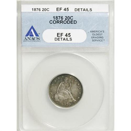 <B>1876 20C --Corroded--ANACS. XF45 Details.</B></I> NGC Census: (8/299). PCGS Population (29/354). Mintage: 14,600. Numismedia Wsl. Price for NGC/PCGS coin in XF45: $401. (#5299)<BR><BR><B>Coin Engraver:</B> William Barber<BR><BR><b>Shipping:</b> Coins & Currency (<a target="_blank" href="http://www.heritageauctions.com/common/shipping.php">view shipping information</a>)