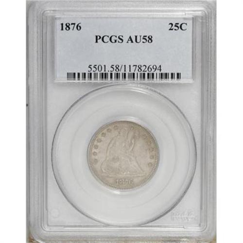 <B>1876 25C AU58 PCGS.</B></I> PCGS Population (28/364). NGC Census: (33/295). Mintage: 17,817,150. Numismedia Wsl. Price for NGC/PCGS coin in AU58: $200. (#5501)<BR><BR><B>Coin Engraver:</B> Christian Gobrecht<BR><BR><b>Shipping:</b> Coins & Currency (<a target="_blank" href="http://www.heritageauctions.com/common/shipping.php">view shipping information</a>)