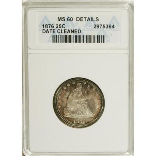 <B>1876 25C --Date Cleaned--ANACS. MS60 Details.</B></I> NGC Census: (5/287). PCGS Population (9/344). Mintage: 17,817,150. Numismedia Wsl. Price for NGC/PCGS coin in MS60: $221. (#5501)<BR><BR><b>Shipping:</b> Coins & Currency (<a target="_blank" href="http://www.heritageauctions.com/common/shipping.php">view shipping information</a>)