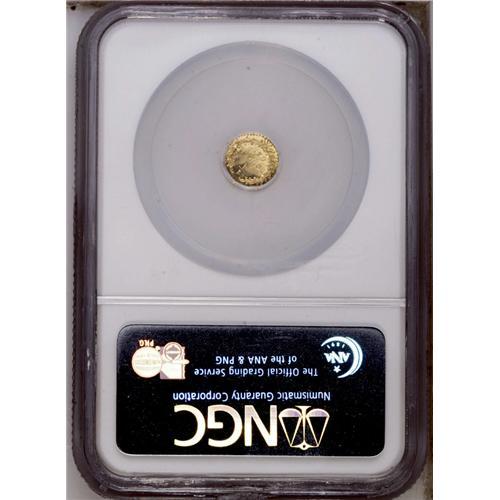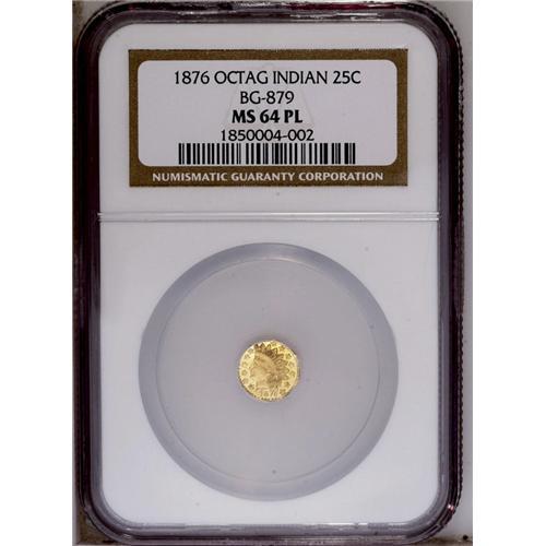 <B>1876<25C> Indian Octagonal 25 Cents, BG-799, Nearly R.6, MS64 Prooflike NGC.</B></I> Misattributed in the NGC holder as BG-879. Reverse rotated about 210 degrees clockwise. Bright yellow-gold surfaces yield fabulous contrast. A few wispy handling marks are noted. <BR><BR><B>Important notice:</B> Heritage usually auctions material at the rate of 200-250 lots per hour. On some occasions eBay Live bid software or the Internet may not be able to keep up with the pace of the auction. We recommend placing a realistic absentee bid now as insurance to avoid disappointment. Occasionally the auctioneer may eliminate or reject an eBay Live bid, and the auctioneer may also reopen a lot after the close of the eBay live bidding (usually because we missed an audience bid), and may reject your bid even if it shows you as the winning bidder. By bidding via eBay Live, you agree that Heritage may award the lot to another bidder at its sole discretion under the circumstances described above or any other reasonable circumstances. Since eBay bids are not shown to us until we open the lot on the floor, we treat those bids just like floor bids. In most cases the floor responds before the eBay bid is presented to us, due to Internet lag time, so for consistency we have made it a policy that floor bids are always considered first over tie eBay live bids. Also please note that all Heritage lots purchased through eBay Live carry a 20% Buyer's Premium. Please make sure you read the Terms and Conditions before you bid. This lot is being auctioned in conjunction with a live floor auction by Heritage Galleries & Auctioneers. All final auction and invoice information will be supplied by Heritage Galleries & Auctioneers, and all other information should be considered preliminary. Lot:4790 <BR><BR><B>Winning Notification and Billing:</B> After the FINAL session in this auction is complete, Heritage will send e-mail and snail mail invoices. This process normally takes several days. All final auction and invoice information will be supplied by Heritage Galleries & Auctioneers, and all other information should be considered preliminary. <BR><BR>This auction will be conducted on a live auction floor and over the Internet through eBay Live. If you choose to place an absentee bid, please take a moment to <font color='#0000ff'><u><a href='http://pages.ebay.com/liveauctions/help/before/laabsentee.html'>learn how eBay Live absentee bidding works</a></u></font><font color='#000000'>