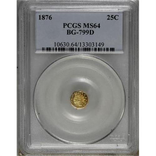 <B>1876 25C Indian Octagonal 25 Cents, BG-799D, R.6, MS64 PCGS.</B></I> A highly attractive example with glassy, prooflike fields and nicely preserved surfaces. Counterclockwise die rotation of approximately 135 degrees is noted. A few wispy pinscratches and slide marks are observed on the obverse. <BR><BR><b>Shipping:</b> Coins & Currency (<a target="_blank" href="http://www.heritageauctions.com/common/shipping.php">view shipping information</a>)