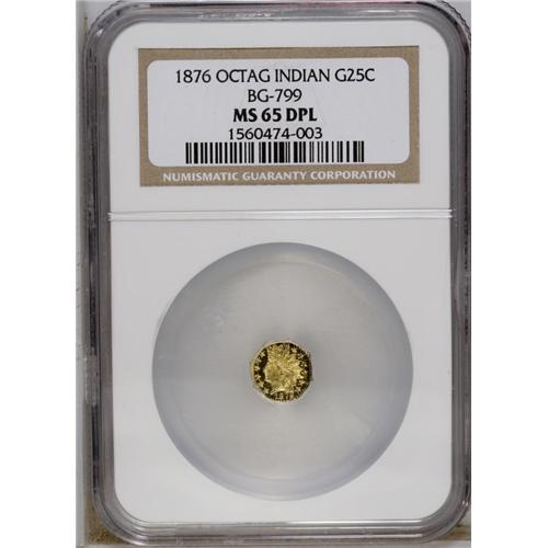 <B>1876 25C Indian Octagonal 25 Cents, BG-799E, High R.7, MS65 Deep Mirror Prooflike NGC.</B></I> Misattributed by NGC as BG-799. A boldly struck and radiant Gem with strongly mirrored fields and pleasing cameo contrast. A small planchet flaw (as made) is noted above the A in DOLLAR.<BR><BR><b>Shipping:</b> Coins & Currency (<a target="_blank" href="http://www.heritageauctions.com/common/shipping.php">view shipping information</a>)