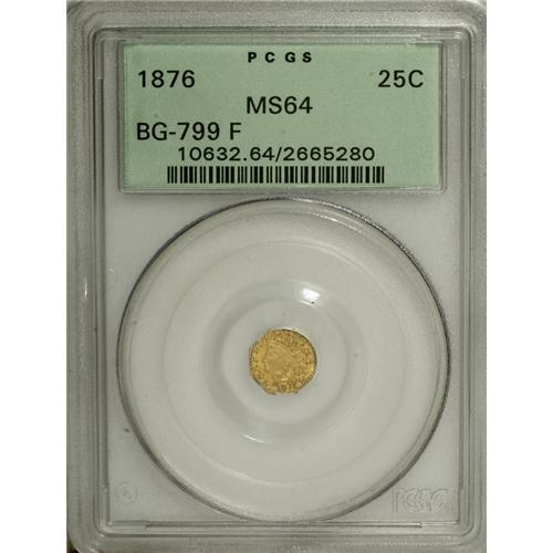 <B>1876 25C Indian Octagonal 25 Cents, BG-799F, Low R.6, MS64 PCGS.</B></I> A prominently reflective near-Gem with smooth fields and a sharply struck portrait. Encased in a green label holder. Population: 13 in 64, 4 finer (4/07).<BR><BR><b>Shipping:</b> Coins & Currency (<a target="_blank" href="http://www.heritageauctions.com/common/shipping.php">view shipping information</a>)