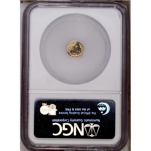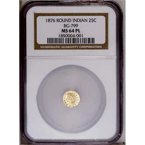 <B>1876<25C> Indian Octagonal 25 Cents, BG-879, R.4, MS64 Prooflike NGC.</B></I> Incorrectly identified as BG-799 on the NGC insert. Generally well struck, with yellow-gold coloration. Die striations are noticed on both sides, and are joined by some hairlines on the reverse. <BR><BR><B>Important notice:</B> Heritage usually auctions material at the rate of 200-250 lots per hour. On some occasions eBay Live bid software or the Internet may not be able to keep up with the pace of the auction. We recommend placing a realistic absentee bid now as insurance to avoid disappointment. Occasionally the auctioneer may eliminate or reject an eBay Live bid, and the auctioneer may also reopen a lot after the close of the eBay live bidding (usually because we missed an audience bid), and may reject your bid even if it shows you as the winning bidder. By bidding via eBay Live, you agree that Heritage may award the lot to another bidder at its sole discretion under the circumstances described above or any other reasonable circumstances. Since eBay bids are not shown to us until we open the lot on the floor, we treat those bids just like floor bids. In most cases the floor responds before the eBay bid is presented to us, due to Internet lag time, so for consistency we have made it a policy that floor bids are always considered first over tie eBay live bids. Also please note that all Heritage lots purchased through eBay Live carry a 20% Buyer's Premium. Please make sure you read the Terms and Conditions before you bid. This lot is being auctioned in conjunction with a live floor auction by Heritage Galleries & Auctioneers. All final auction and invoice information will be supplied by Heritage Galleries & Auctioneers, and all other information should be considered preliminary. Lot:4796 <BR><BR><B>Winning Notification and Billing:</B> After the FINAL session in this auction is complete, Heritage will send e-mail and snail mail invoices. This process normally takes several days. All final auction and invoice information will be supplied by Heritage Galleries & Auctioneers, and all other information should be considered preliminary. <BR><BR>This auction will be conducted on a live auction floor and over the Internet through eBay Live. If you choose to place an absentee bid, please take a moment to <font color='#0000ff'><u><a href='http://pages.ebay.com/liveauctions/help/before/laabsentee.html'>learn how eBay Live absentee bidding works</a></u></font><font color='#000000'>