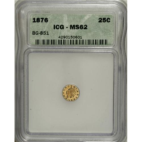 <B>1876 25C Indian Round 25 Cents, BG-851, Low R.7, MS62 ICG.</B></I> A rare variety identified by the small bow on the wreath. Flashy fields are clean aside from a faint diagonal pinscratch through the denominator. Hints of blue-gray toning visit the devices. The A in DOLLAR is weak, as seen on the Roe plate in Breen-Gillio.<BR><BR><b>Shipping:</b> Coins & Currency (<a target="_blank" href="http://www.heritageauctions.com/common/shipping.php">view shipping information</a>)