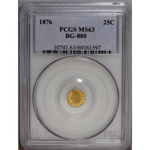 <B>1876 25C Indian Round 25 Cents, BG-880, Low R.6, MS63 PCGS.</B></I> Well struck devices accompany flashy fields. Minor striking indifference on the fraction, and a couple of light handling marks accompany the central reverse. A very scarce variety; the similar BG-879 is more often encountered.