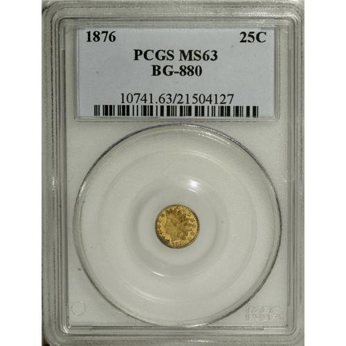 <B>1876 25C Indian Round 25 Cents, BG-880, Low R.6, MS63 PCGS.</B></I> The vibrant yellow-gold surfaces display light greenish accents and well struck design features. The prooflike, watery fields are slightly wavy, as made. Some wispy hairlines are interspersed with die polish lines on the reverse.<BR><BR><b>Shipping:</b> Coins & Currency (<a target="_blank" href="http://www.heritageauctions.com/common/shipping.php">view shipping information</a>)