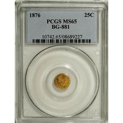 <B>1876 25C Indian Round 25 Cents, BG-881, R.5, MS65 PCGS.</B></I> The lustrous lemon-gold display occasional ruby and ice-blue tints. A small spot separates the 76 in the date. The central reverse is slightly wavy, as made.<BR><BR><b>Shipping:</b> Coins & Currency (<a target="_blank" href="http://www.heritageauctions.com/common/shipping.php">view shipping information</a>)