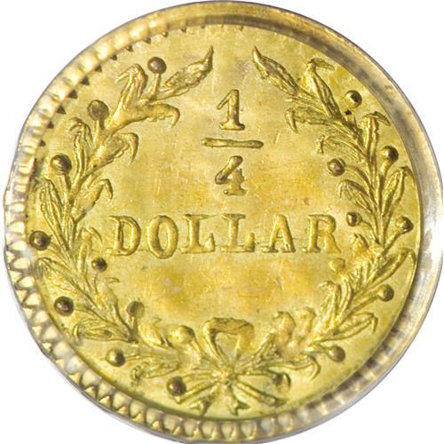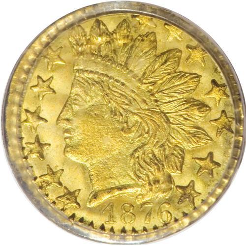 <B>1876 25C Indian Round 25 Cents, BG-882, R.7, MS65 PCGS.</B></I> A well-made Gem of this rare die pairing. The fields are smooth and reflective, and the strike is precise. The reverse has faint but lengthy die cracks, unmentioned in Breen-Gillio under BG-882 but the same reverse die is described as "shattered within wreath" under BG-883. The dies are widely rotated. Population: 5 in 65, 0 finer (3/07).<BR><I>From The Diamond K Collection of California Fractional Gold.</B></I><BR><BR><b>Shipping:</b> Coins & Currency (<a target="_blank" href="http://www.heritageauctions.com/common/shipping.php">view shipping information</a>)