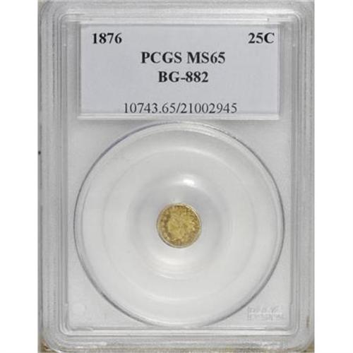 <B>1876 25C Indian Round 25 Cents, BG-882, R.7, MS65 PCGS.</B></I> A well-made Gem of this rare die pairing. The fields are smooth and reflective, and the strike is precise. The reverse has faint but lengthy die cracks, unmentioned in Breen-Gillio under BG-882 but the same reverse die is described as "shattered within wreath" under BG-883. The dies are widely rotated. Population: 5 in 65, 0 finer (11/07).<BR><BR><b>Shipping:</b> Coins & Currency (<a target="_blank" href="http://www.heritageauctions.com/common/shipping.php">view shipping information</a>)