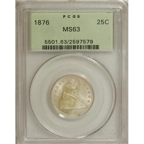 <B>1876 25C MS63 PCGS.</B></I> PCGS Population (105/153). NGC Census: (84/135). Mintage: 17,817,150. Numismedia Wsl. Price for NGC/PCGS coin in MS63: $392. (#5501)<BR><BR><B>Coin Engraver:</B> Christian Gobrecht<BR><BR><b>Shipping:</b> Coins & Currency (<a target="_blank" href="http://www.heritageauctions.com/common/shipping.php">view shipping information</a>)