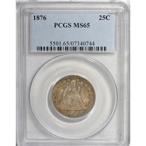 <B>1876 25C MS65 PCGS.</B></I> Interlaced pumpkin-orange, russet, and silver-gray patina covers the lustrous surfaces. A solidly struck and attractive Gem from the centennial year. Population: 30 in 65, 20 finer (11/06).<BR><BR><b>Shipping:</b> Coin/Currency (<a target="_blank" href="http://www.heritageauctions.com/common/shipping.php">view shipping information</a>)