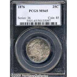 <B>1876 25C MS65 PCGS.</B></I> Well struck with unevenly distributed green, gold, and rose patina, and satiny surfaces that seem entirely undisturbed by grade-limiting contact remnants. Population: 26 in 65, 20 finer (2/05).