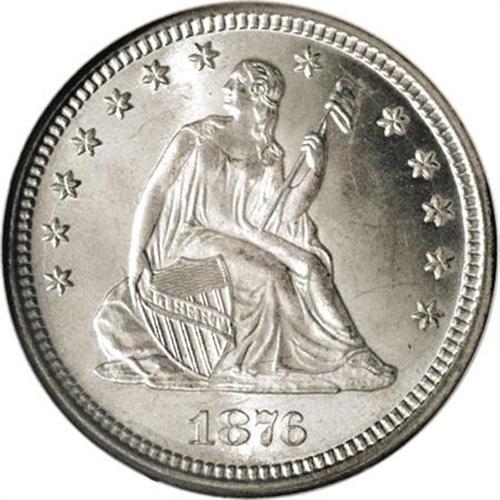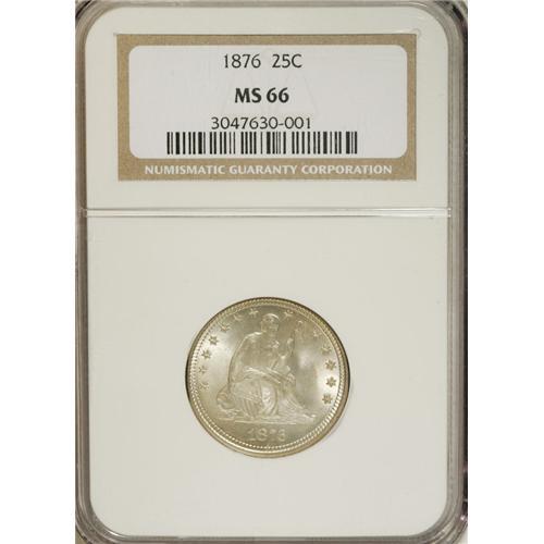 <B>1876 25C MS66 NGC.</B></I> Type Two Reverse with the short feet on the A in STATES. With a mintage of nearly 18 million pieces, the 1876 is one of the most common Seated Liberty quarters. The certified population falls precipitously at the MS66 level, however. The condition scarcity Premium Gem in this lot displays frosty luster and essentially untoned surfaces. A light crack encircles each side, but blemishes are absent. Census: 18 in 66, 7 finer (4/07).<BR><BR><b>Shipping:</b> Coins & Currency (<a target="_blank" href="http://www.heritageauctions.com/common/shipping.php">view shipping information</a>)