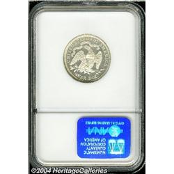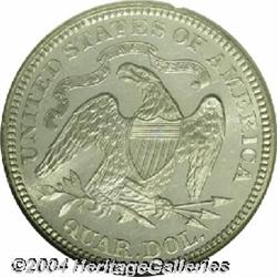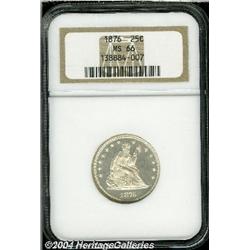 <B>1876<25C> MS66 NGC.</B></I> This issue's original mintage of 17.8 million pieces is the highest in the entire Seated Quarter series of 1838-1891. Along with the 1853 Arrows and Rays, the 1876 is the most frequently offered date in today's market. Of course, most extant '76-P Quarters grade below the MS66 level. Intensely lustrous with a richly frosted sheen, this coin is completely white and untoned overall. Both sides are crisply detailed with no abrasions of note. An elusive opportunity for an untoned type coin representative. <BR><BR><B>Important notice:</B> Heritage usually auctions material at the rate of 200-250 lots per hour. On some occasions eBay Live bid software or the Internet may not be able to keep up with the pace of the auction. We recommend placing a realistic absentee bid now as insurance to avoid disappointment. Occasionally the auctioneer may eliminate or reject an eBay Live bid, and the auctioneer may also reopen a lot after the close of the eBay live bidding (usually because we missed an audience bid), and may reject your bid even if it shows you as the winning bidder. By bidding via eBay Live, you agree that Heritage may award the lot to another bidder at its sole discretion under the circumstances described above or any other reasonable circumstances. Since eBay bids are not shown to us until we open the lot on the floor, we treat those bids just like floor bids. In most cases the floor responds before the eBay bid is presented to us, due to Internet lag time, so for consistency we have made it a policy that floor bids are always considered first over tie eBay live bids. Also please note that all Heritage lots purchased through eBay Live carry a 20% Buyer's Premium. Please make sure you read the Terms and Conditions before you bid.