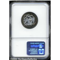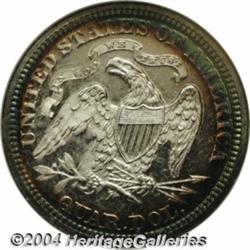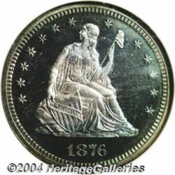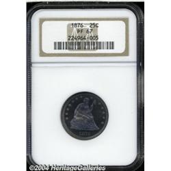 <B>1876<25C> PR 67 NGC.</B></I> Briggs 8-H. Pleasant toning greets the viewer on both sides of this Condition Census proof Quarter from the United States' Centennial year. Streaks of lavender color overlay the otherwise cobalt-blue obverse. The reverse, on the other hand, is untoned with halos of orange-russet and sea-green peripheral shadings. We can see ample evidence of a cameo finish, particularly on the reverse (of course), and both sides are silent on the subject of distracting blemishes. Fully brought up throughout. NGC and PCGS combined have seen just five coins at the present grade level; there are none finer (7/04). <BR><BR><B>Important notice:</B> Heritage usually auctions material at the rate of 200-250 lots per hour. On some occasions eBay Live bid software or the Internet may not be able to keep up with the pace of the auction. We recommend placing a realistic absentee bid now as insurance to avoid disappointment. Occasionally the auctioneer may eliminate or reject an eBay Live bid, and the auctioneer may also reopen a lot after the close of the eBay live bidding (usually because we missed an audience bid), and may reject your bid even if it shows you as the winning bidder. By bidding via eBay Live, you agree that Heritage may award the lot to another bidder at its sole discretion under the circumstances described above or any other reasonable circumstances. Since eBay bids are not shown to us until we open the lot on the floor, we treat those bids just like floor bids. In most cases the floor responds before the eBay bid is presented to us, due to Internet lag time, so for consistency we have made it a policy that floor bids are always considered first over tie eBay live bids. Also please note that all Heritage lots purchased through eBay Live carry a 20% Buyer's Premium. Please make sure you read the Terms and Conditions before you bid. </span></font></tr></table></td></tr></table>