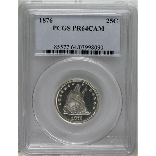 <B>1876 25C PR64 Cameo PCGS.</B></I> Type One Reverse. An essentially untoned Choice proof from the centennial year that has bold detail and undeniable contrast. An isolated contact mark is noted in the right obverse field. Population: 7 in 64 Cameo, 3 finer (2/07).<BR><BR><b>Shipping:</b> Coins & Currency (<a target="_blank" href="http://www.heritageauctions.com/common/shipping.php">view shipping information</a>)