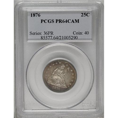 <B>1876<25C> PR64 Cameo PCGS.</B></I> Type One Reverse. Attractive to the eye for the contrast and deep golden-gray fields which offset the frosty white devices. Hairlines account for the grade and contact marks on Liberty are seen in the delicate frost. Fully struck and popular for the Centennial year issue.