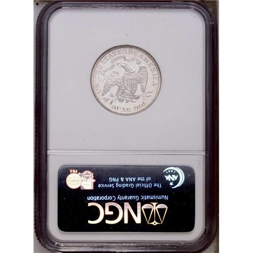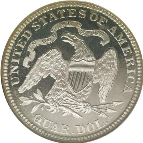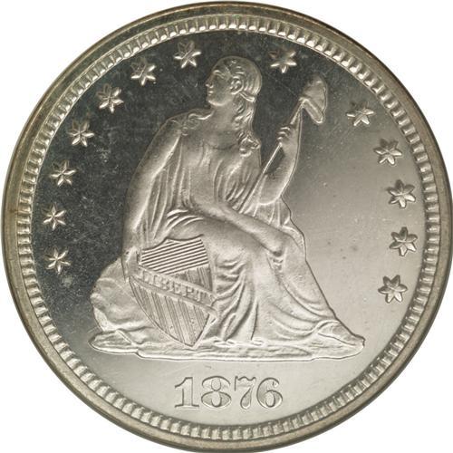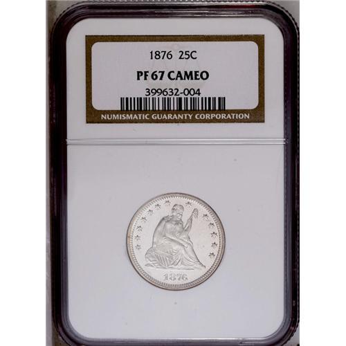 <B>1876<25C> PR67 Cameo NGC.</B></I> Type Two Reverse. The surfaces are untoned throughout with thick mint frost over the devices. The devices contrast sharply against the jet-black mirrored fields, providing beautiful cameo contrast. A great Superb Gem example of this proof Seated quarter issue. Census: 5 in 67 Cameo, 0 finer (2/06).
