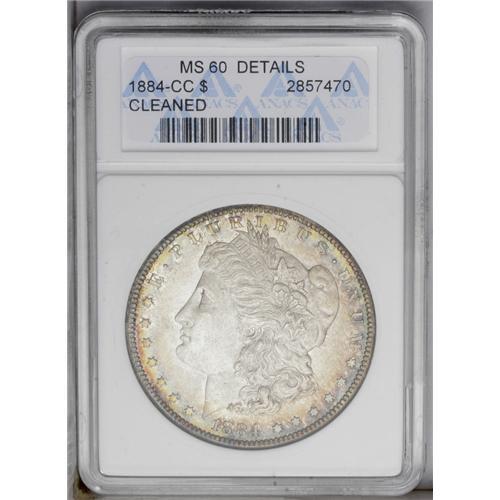 <B>1876<25C> Quarter--Cleaned--ANACS, XF45 Details,</B></I> unnaturally bright under copper-gold and turquoise toning; <B>1884-CC Silver Dollar--Cleaned--ANACS, MS60 Details,</B></I> a moderately toned CC dollar with innumerable wispy hairlines on the reverse; and a <B>1922 Silver Dollar MS64 ANACS,</B></I> a creamy silver-gray example.