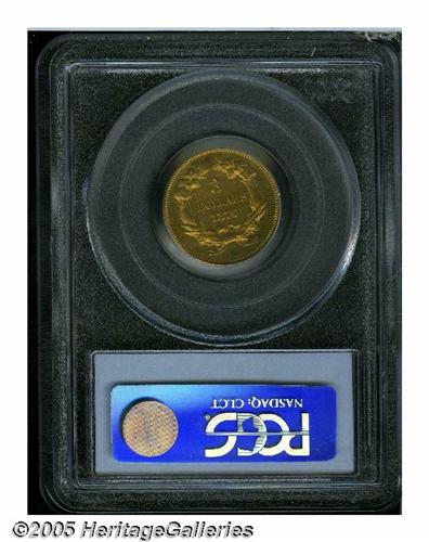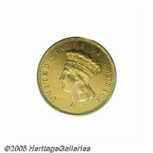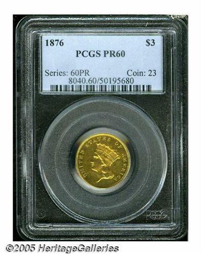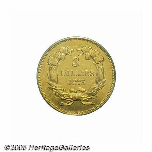 <B>1876<$3> PR60 PCGS.</B></I> The proof-only status of the 1876 Three Dollar has given it much notoriety over the decades and its rarity is assured by a mintage of just 45 coins. One must allow for duplication in arriving at the number of surviving 1876 Threes, but even so it seems that no more than 25-30 pieces are extant today. Like several specimens that we have offered over the years, the present example has seen its share of mishandling. A uniform reddish patina that covers both sides downplays the effect of numerous wispy blemishes, the most obvious of which is a shallow pinscratch to the left of the wreath on the reverse. The coin's watery brilliance is on full display in spite of these noticeable distractions. Undeniably rare and always in demand.