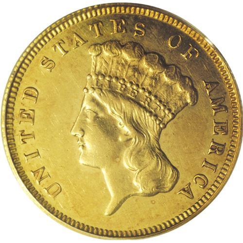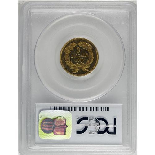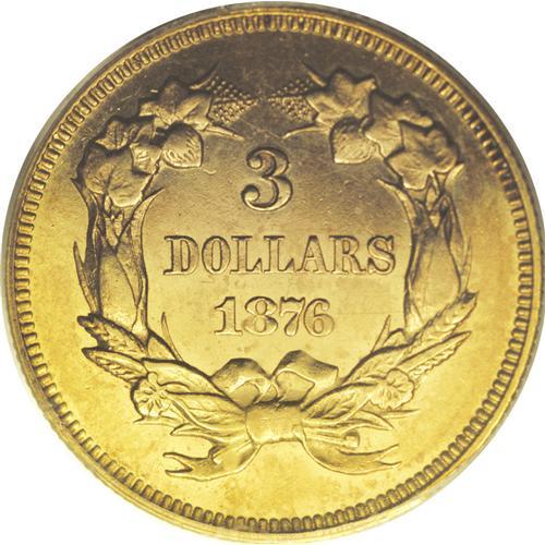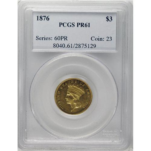 <B>1876 $3 PR61 PCGS.</B></I> Although not quite as rare as the 1875, the proof-only 1876 is an immensely popular issue that is well known among both dedicated gold specialists and more casual numismatists. Actually, the 1876 is not as rare as some other proofs in this series (such as the 1861, 1874, and 1878), but the lack of a similarly dated business strike delivery explains the greater demand that this issue enjoys. Only 45 proofs were originally produced, and (unfortunately) a decent number of the 33 or 34 survivors are impaired. Although the present example exhibits some grade-limiting hairlines, the overall eye appeal is above average for the PR61 grade level. The color is a deep, rich, green-gold shade over which orange-gold highlights have gathered. There are no sizeable or unsightly handling marks, and the only noteworthy pedigree marker is a lintmark in the reverse field above the S in DOLLARS.<BR><BR><b>Shipping:</b> Coin/Currency (<a target="_blank" href="http://www.heritageauctions.com/common/shipping.php">view shipping information</a>)