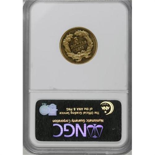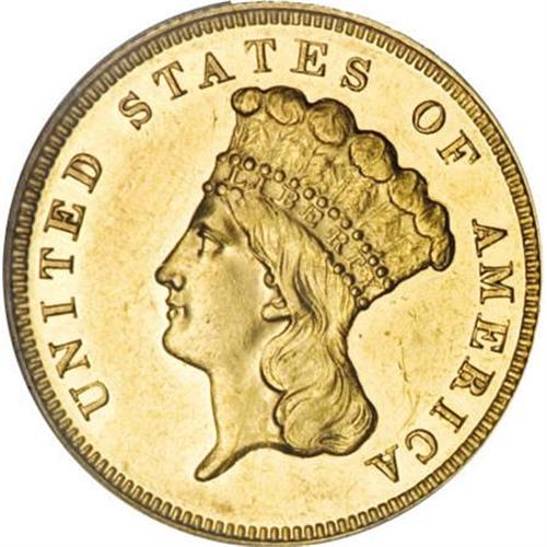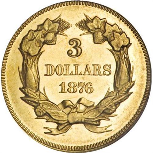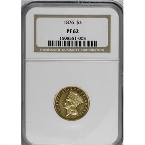 <B>1876 $3 PR62 NGC.</B></I> Though not so popular as the lower-mintage 1875 issue, the 1876, as the other proof-only date in the series, has attracted plenty of attention over the years. A handful of clandestine restrikes add to the official production of 45 pieces, but this fact has done little to cool enthusiasm for the coins.<BR> Despite a number of hairlines in the fields, this decisively struck example shows plenty of flash at the margins. The surfaces are predominantly yellow-gold with whispers of green-gold on the reverse. Both sides display minor contrast, though not enough to warrant a Cameo designation. Still, a captivating and important representative from this centennial-year issue.<BR><BR><B>Coin Engraver:</B> James B. Longacre<BR><BR><b>Shipping:</b> Coins & Currency (<a target="_blank" href="http://www.heritageauctions.com/common/shipping.php">view shipping information</a>)