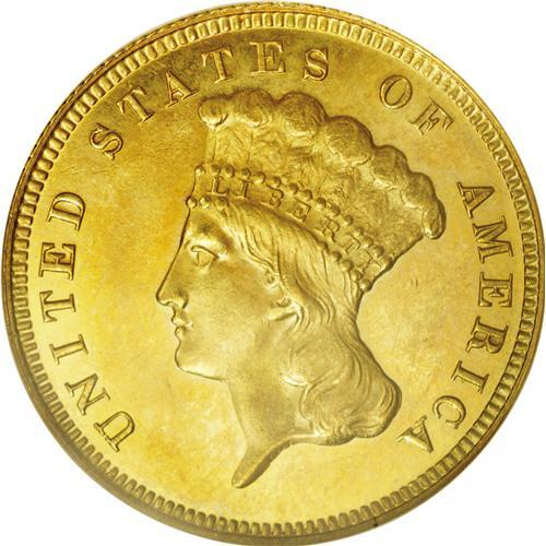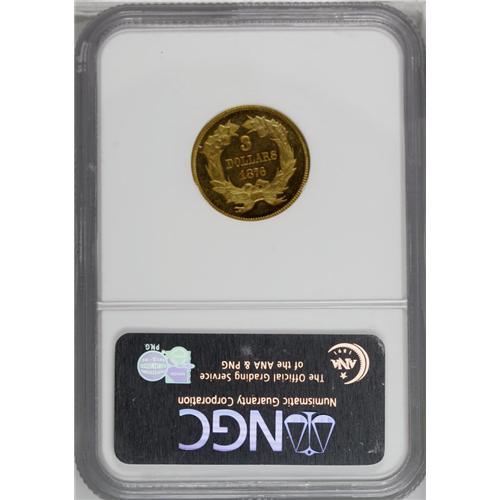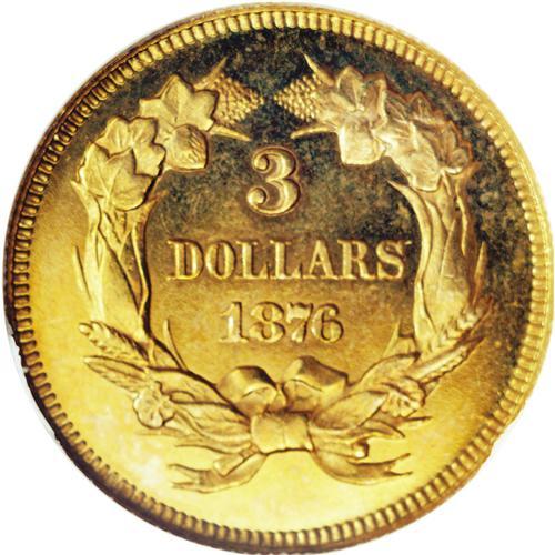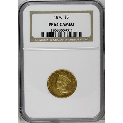 <B>1876<$3> PR64 Cameo NGC.</B></I> Rarities abound in the three dollar gold coin series, including the unique 1870-S issue and the extremely rare 1875 and 1876 issues. This example provides an extremely important offering of the latter issue, a proof-only date, with a total mintage of just 45 coins. From that low mintage quantity, about 25 to 30 examples are known today, and many of the survivors are impaired in one manner or another. For an alternative point of view regarding the surviving population, Q. David Bowers wrote in the Bass <I>Sylloge</B></I> that about 40 to 60 examples still exist, the higher figure actually exceeding the recorded mintage, which suggests that restrikes were produced at some later date.<BR> This example is a splendid near-Gem with delightful cameo contrast. The surfaces have a few scattered hairlines and other minor blemishes as expected for the grade. Sharply struck with broad borders and excellent design definition. The surface have rich honey-gold color with hints of deeper orange toning. The obverse has numerous tiny rust pits through Liberty and the headdress, indicating that this example is, in fact, a restrike produced at an unspecified later date. <BR><BR><B>Important no