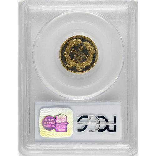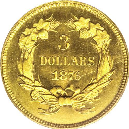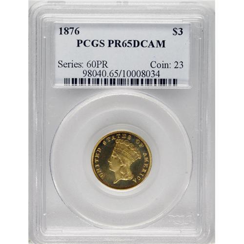 <B>1876 $3 PR65 Deep Cameo PCGS.</B></I> With the exception of the unique 1870-S, the 1875 and 1876 are perhaps the most widely recognized rarities in the three dollar gold series. This is because both of the latter dates were produced solely in proof format. The 1876 has a paltry original mintage of 45 pieces, with just 25-30 coins believed extant (per Breen in his 1988 <I>Complete Encyclopedia,</B></I> who also states that at least seven examples are impaired). Today, we closely agree with Breen's estimate. There are no existing pedigree or census records for this issue, mostly due to the extreme difficulty of plate matching proof gold pieces. Such a record is the only certain way to know just how many pieces actually do survive. Interestingly, the 1876 three dollar proof is not as rare as the proof 1861, 1874, or 1878 issues, but the lack of a business strike 1876 three dollar explains the higher profile of the present issue. Tied for second finest of only six Deep Cameo survivors certified by PCGS (1/07), this orange-gold coin is deeply mirrored in the fields. The fully struck devices are richly frosted with no distracting blemishes, save for a tiny nick on Liberty's neck. The fields have faint hairlines, and a few striations are seen at the center of the reverse, but the only worthwhile pedigree marker is an area of obverse planchet discoloration at the U in UNITED. Population: 4 in 65 Deep Cameo, 1 finer (1/07).<BR><BR><b>Shipping:</b> Coins & Currency (<a target="_blank" href="http://www.heritageauctions.com/common/shipping.php">view shipping information</a>)