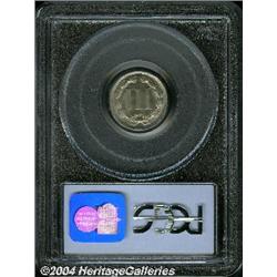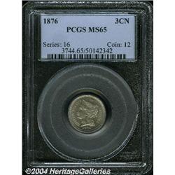 <B>1876<3CN> MS65 PCGS.</B></I> Fully struck, the surfaces are toned medium gray over each side. The obverse rim is made a bit unevenly, otherwise the piece is a near-perfect Gem in every respect, and is a rare item as such. Population: 23 in 65, 4 finer (9/04). <BR><BR><B>Important notice:</B> Heritage usually auctions material at the rate of 200-250 lots per hour. On some occasions eBay Live bid software or the Internet may not be able to keep up with the pace of the auction. We recommend placing a realistic absentee bid now as insurance to avoid disappointment. Occasionally the auctioneer may eliminate or reject an eBay Live bid, and the auctioneer may also reopen a lot after the close of the eBay live bidding (usually because we missed an audience bid), and may reject your bid even if it shows you as the winning bidder. By bidding via eBay Live, you agree that Heritage may award the lot to another bidder at its sole discretion under the circumstances described above or any other reasonable circumstances. Since eBay bids are not shown to us until we open the lot on the floor, we treat those bids just like floor bids. In most cases the floor responds before the eBay bid is presented to us, due to Internet lag time, so for consistency we have made it a policy that floor bids are always considered first over tie eBay live bids. Also please note that all Heritage lots purchased through eBay Live carry a 20% Buyer's Premium. Please make sure you read the Terms and Conditions before you bid.